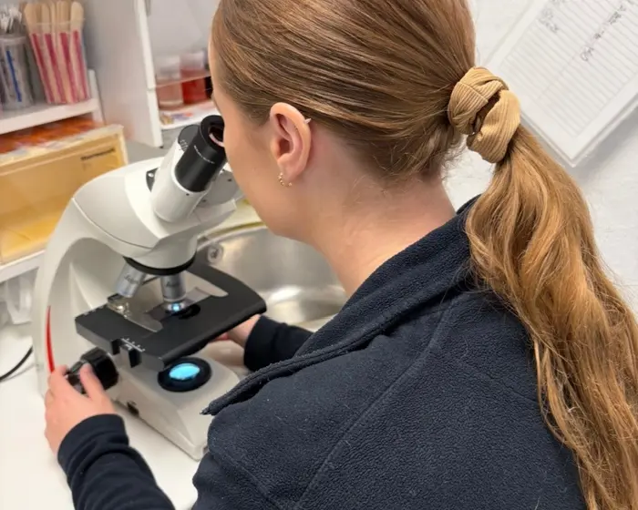 Vi har eget laboratorium og foretager derfor mange laboratorieundersøgelser på klinikken. Dette betyder at vi har et hurtigt resultat på prøverne, og eksempelvis kan foretage blodprøver forud for en operation. Vi foretager derudover også farvninger og mikroskopisk undersøgelse af urinprøver, finnålsaspirater, svaberprøver mv.